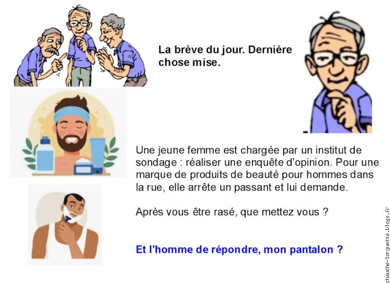 Une jeune femme est chargée par un institut de sondage : réaliser une enquête d'opinion. Pour une marque de produits de beauté pour hommes dans la rue, elle arrête un passant et lui demande.