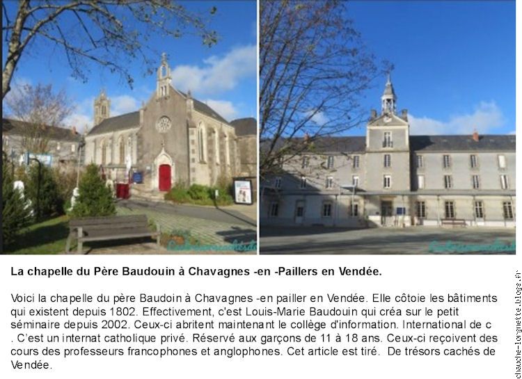 Voici la chapelle du père Baudoin à Chavagnes -en pailler en Vendée. Elle côtoie les bâtiments qui existent depuis 1802. Effectivement, c'est Louis-Marie Baudouin qui créa sur le petit séminaire depuis 2002. Ceux-ci abritent maintenant le collège d'information. International de c