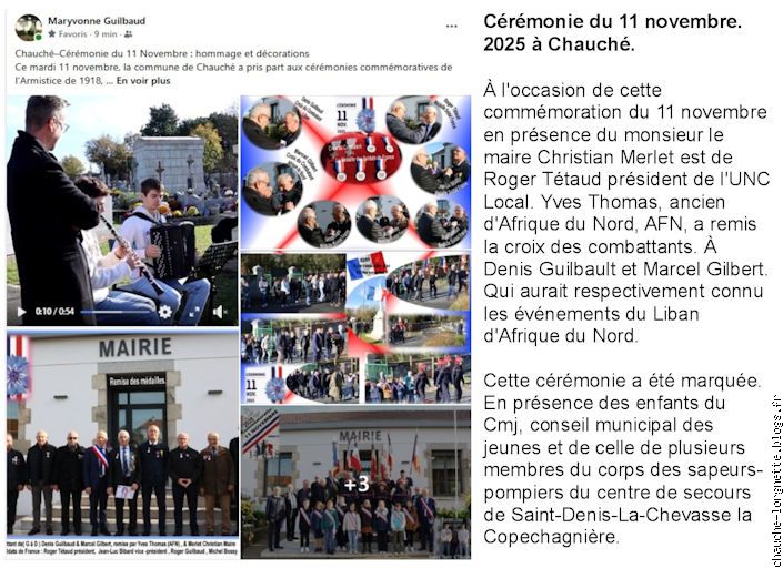 À l'occasion de cette commémoration du 11 novembre en présence du monsieur le maire Christian Merlet est de Roger Tétaud président de l'UNC Local. Yves Thomas, ancien d'Afrique du Nord, AFN, a remis la croix des combattants. À Denis Guilbault et Marcel Gilbert. Qui aurait respectivement connu les événements du Liban d'Afrique du Nord.