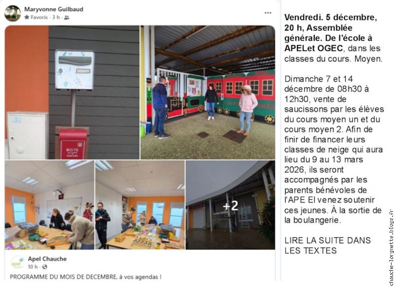 Dimanche 7 et 14 décembre de 08h30 à 12h30, vente de saucissons par les élèves du cours moyen un et du cours moyen 2. Afin de finir de financer leurs classes de neige qui aura lieu du 9 au 13 mars 2026, ils seront accompagnés par les parents bénévoles de l'APE El venez soutenir ces jeunes. À la sortie de la boulangerie.